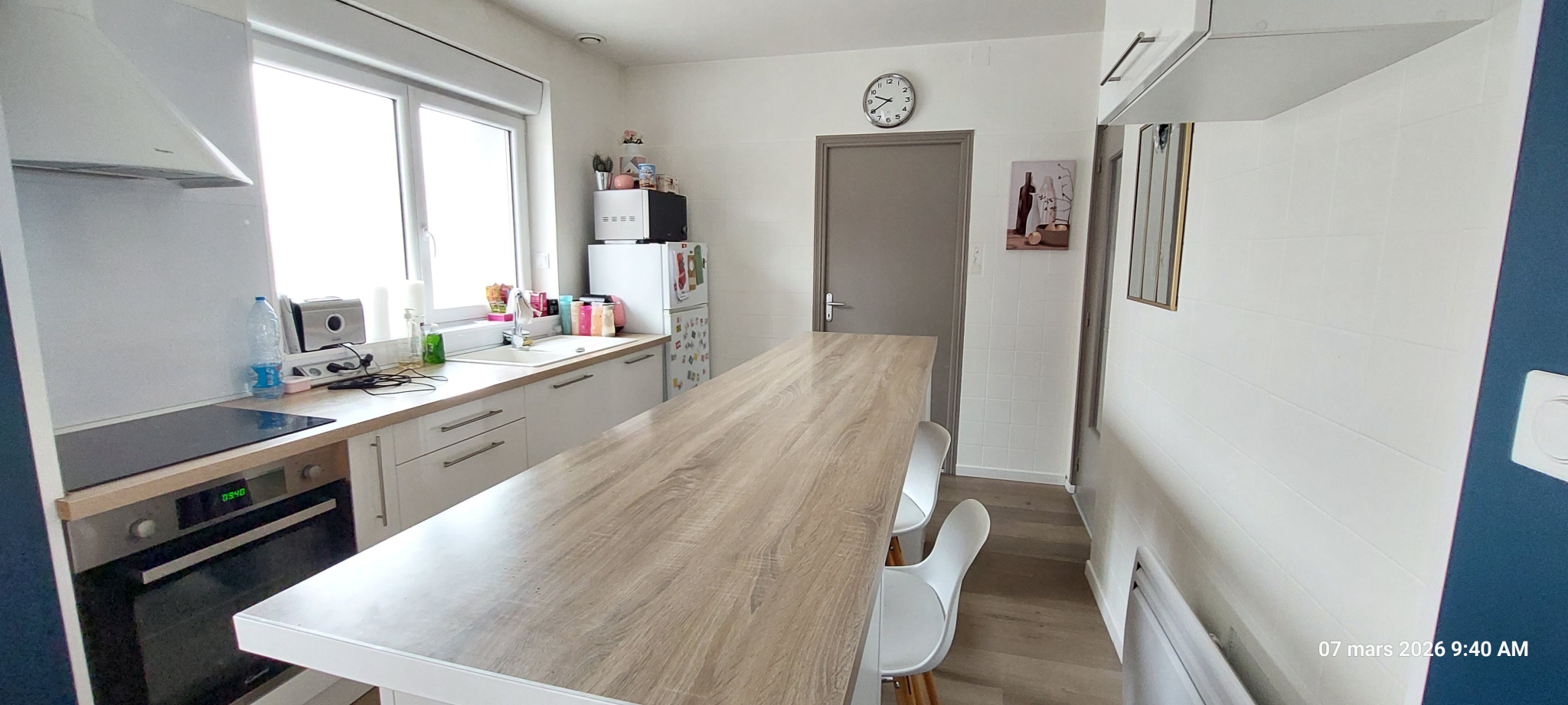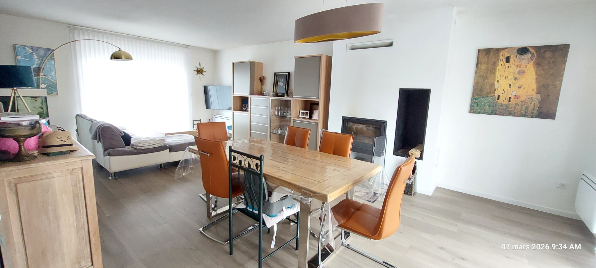 - au rez-de-chaussée : grand hall d'entrée avec placard, salon/séjour très lumineux avec cheminée feu de bois ouvert sur cuisine équipée (45 m²), 3 chambres dont 2 avec placard (de 9.5 à 14.5 m²), salle de bain avec douche, lingerie, wc
